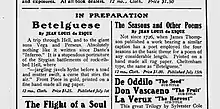 Featured in the section "In the World of Books" of April 18, 1909 edition of the Los Angeles Herald, Betelguese, a Trip Through Hell was likened to George Sterling's poem "The Wine of Wizardry". In comparing the two poetic works, the columnist felt that "Betelguese" had made "Mr. Sterling's poor dragons look like small pink lizards," stating that De Esque's work had "immortalized the dreams of the opium eater."[4] In later years, it had also been compared to the poetic work of Kenneth Patchen.[19]