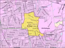 On maps just before the arrival of the Long Island Rail Road (LIRR), the name Bethpage appears for a community now included in both the post office district and school district of the adjacent community of Farmingdale.[6] In 1841,[7] train service began to Farmingdale station, near a new settlement less than a mile eastward from what had previously appeared on maps as Bethpage. Schedules at that time do not mention Bethpage as a stop, but have a notation "late Bethpage".[8] On an 1855 map,[9] the location identified as Bethpage has shifted slightly westward to include a nearby area now called Plainedge.