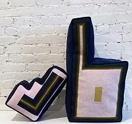 In 2018, Kaufman expanded her interest in form and color to include volume, creating needlepoint sculptures referencing pillows as a humorous device; she also produced one-inch-thick works she termed "drawings in needlepoint."[3][26] She exhibited this work in "14 Sculptures, 1 Painting" (Leslie Tonkonow, 2022), displaying the sculptures on pedestals and platforms. Hyperallergic writer Ela Bittencourt contended that the sculptures "coaxed humor and joy" out of analytical styles such as constructivism and likened them to work by Sophie Taeuber-Arp and Eva Hesse that undermined modernist sculptural hierarchies such as the privileging of fine over applied arts or hard, rigid form over soft.[3] She wrote that the "domestic" works pushed "the grid’s implausible pliability until it gives, causing 'slippage' or sag … corners bend, squares bulge out of their frames, asymmetries get thrown off by bits of plushy excess."[3] This body of work was also exhibited at Pace Gallery and Hunter Dunbar Projects in New York in 2022.[26][32]