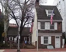 Evidence for the precise location of Ross's home came from verification provided by several surviving family members,[2] although the best archival evidence indicates the house would have been adjacent to the one that still stands today as The Betsy Ross House.[3] The 1937 Philadelphia Guide noted that, after the current Betsy Ross House was selected as the Flag House, the adjacent building where Ross may have indeed lived "was torn down to lessen the hazards of fire, perhaps adding a touch of irony to what may well have been an error in research."[4]