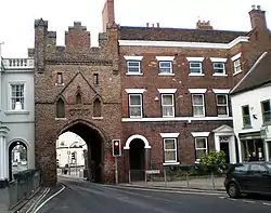 In the 1640s civil war broke out between the supporters of Charles I and Parliament. The defences of Beverley were then reinforced with new ditches, the gatehouses were repaired and a garrison of 900 men guarded the town.[1] Once again, these defences were not sufficient and Royalist forces were able to successfully raid the town.[1] After the war the defences were neglected and ditches began to be filled in as the town expanded.[1] Today only traces of the original ditches and the North Bar gate remain intact; the latter is considered by archaeologists Oliver Creighton and Robert Higham to be the "best surviving example in England of a brick-built town gate".[4][5] The gatehouse is protected as a grade I listed building.[6]
