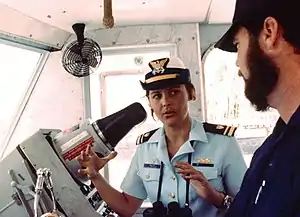 Lt. (j.g.) Beverly Kelley on the bridge of USCGC Cape Newagen