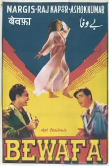 Bewafa (lit.'Disloyal') is a 1952 Indian film directed by M. L. Anand, starring the hit Bollywood pair Nargis, Raj Kapoor, along with Ashok Kumar as a lead actor and he appears as a painter in the movie. It is considered one of the best films of the pair Raj Kapoor and Nargis.
