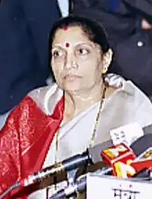 Bhavna Chikhalia (Gujarati: ભાવના ચીખલિયા; 14 February 1955 – 28 June 2013) was a Minister of State of Parliamentary Affairs and of Tourism and Culture in Government of India from 2003 to 2004. She was also a member of Lok Sabha and the first lady of Gujarat who won four consecutive term of Lok Sabha from Junagadh constituency, Gujarat (from 1991 to 2004). She was executive secretary of the Bharatiya Janata Party (BJP) Parliamentary Wing from 1993 to 1996, and party Whip and Party Vice President in 1998. She was Chairperson of the Railway Convention Committee during 1999–2002.