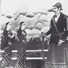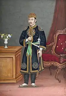 Bhimsen Thapa[note 2] was born in August 1775 at Pipal Thok village of Gorkha district, to father Amar Singh Thapa (sanu)[note 3] and mother Satyarupa Maya.[12] Bhimsen belonged to a Chhetri family of Bharadars (courtiers).[13] His ancestors were members of Bagale Thapa clan from Jumla who migrated eastwards.[12][5] His grandfather was Bir Bhadra Thapa, a courtier in Prithvi Narayan Shah's army.[12] Bhimsen Thapa had four brothers — Nain Singh, Bakhtawar Singh, Amrit Singh, and Ranbir Singh.[14][15] From his step-mother, he had two brothers — Ranbam and Ranzawar.[15] While it is not certain when Bhimsen got married, he had three wives with whom he begot one son, that died at an early age in 1796, and three daughters – Lalita Devi, Janak Kumari and Dirgha Kumari.[15] Lack of a son caused him to adopt Sher Jung Thapa, son[15] or grandson[16] of his brother Nain Singh.[note 4]