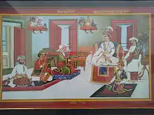 That same year in 1797, Girvan Yuddha Bikram Shah was born and was hastily declared the crown prince.[25] However, within a year of Girvan's birth, Kantavati contracted tuberculosis; and it was advised by physicians that she perform ascetic penances to cure herself. To make sure that Girvan succeeded to the throne while Kantavati was still alive, Rana Bahadur, aged just 23, abdicated in favor of their son on 23 March 1799, placing his first wife, Rajrajeshwori, as the regent.[25] He joined his ailing wife, Kantavati, with his second wife, Subarnaprabha, in ascetic life and started living in Deopatan, donning saffron robes and titling himself Swami Nirgunanda or Nirvanananda.[note 6] This move was also supported by all the courtiers who were discontented with his wanton and capricious behavior.[21][25] It was around this time that both Bhimsen Thapa and his father Amar Singh Thapa (sanu) were promoted from Subedar to the rank of Sardar, and Bhimsen began to serve as the ex-King's chief bodyguard.[27] Bhimsen received the position of personal secretary of King Rana Bahadur from the patronage of Mulkaji Kirtiman Singh Basnyat, since both his father and grandfather were in close military affiliations with Kaji Abhiman Singh Basnyat - the uncle of Kirtiman Singh.[28] Meanwhile, Rana Bahadur's renunciation lasted only a few months. After the inevitable death of Kantavati, Rana Bahadur suffered a mental breakdown during which he lashed out by desecrating temples and cruelly punishing the attendant physicians and astrologers.[29] He then renounced his ascetic life and attempted to re-assert his royal authority.[30] This led to a direct conflict with almost all the courtiers who had pledged a holy oath of allegiance to the legitimate King Girvan; this conflict eventually led to the establishment of a dual government and to an imminent civil war, with Damodar Pande leading the military force against the dissenting ex-King and his group.[31][30] Since most of the military officers had sided with the courtiers, Rana Bahadur realized that his authority could not be re-established; and he was forced to flee to the British-controlled city of Varanasi in May 1800.[31][30]