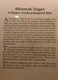 Bhismaknagar is an important ancient archeological site. The site must have been a stronghold of the Chutias. The ruins have been dated between the 11th-15th centuries.[9] Bhismaknagar has been identified with Sadhayapuri (or Svadhayapuri), the political centre of the Chutia Kingdom.[10] Based on an inscriptions on brick, it is assumed to have been the capital of Chutia king Lakṣmīnārāyaṇa, of the early 15th century. Paleographical analysis supports this dating.[11]