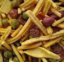 Bhuja is the generic name for puffed rice interchangeably used for a snack mix that originated in some parts of India and is widely popular there. It is a spiced mix of crackers, dried noodles, dried peas, peanuts, and other dried nuts with the main ingredient being puffed rice. It is also commonly found in most British commonwealth supermarkets, sold under several brand names or even in the bulk foods aisle.