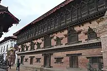 The palace of fifty five windows (Nepal bhasa: 𑐒𑐾𑐒𑐵𑐥𑐵𑐗𑑂𑐫, ngé ngāpā jhya) was the remodeling of a palace first constructed by King Jayayakshya Malla which was damaged in the earthquake of 1681.[113] Bhupatindra later remodeled the palace with fifty-five windows and today is considered a great example of Nepalese woodcarving.[113] There is one misconception that Bhupatindra Malla built the palace with fifty-five windows to provide one for each of his fifty-five wives.[114] However, there isn't much evidence to support this as Bhupatindra likely only had a single queen. Moreover, the palace was likely made for musical purposes as supported by the recent discoveries of 147 carvings of musical rāgas and their names on the cornice separating the ground floor and the first floor of the palace.[115][116]