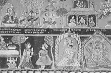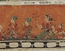 Bhupatindra Malla was married to Vishva Lakshmi on 4 November 1687, when he was 13 years old.[24][29] According to contemporary ledgers, the bakery work for the wedding started on 25 June 1687.[30] By September, Jitamitra Malla had sent letters to officials in Thimi, Banepa and other cities within the kingdom.[30] The letters contained the amount of tax money required from the cities and the ingredients required for the feast. [30][31] In the feast following the wedding, all the citizens of Bhaktapur were invited.[32] Likewise, 16,244 citizens from other cities within the kingdom were also invited.[30] Jitamitra Malla himself wrote a Newari play titled "Madālasā Harana" which was performed during the wedding.[24] Dancers from the royal court of Kantipur as well as other citizens from Kantipur were invited to perform in the ceremony.[33] The dancers from Kantipur performed a dance named "Bhimānanda pyākhan" for which they were paid 20 rupees.[34] Similarly, dancers from Thimi and Sāngā, which lied within the Kingdom of Bhaktapur, were only paid 8 rupees for their performance during the weeding.[34]
