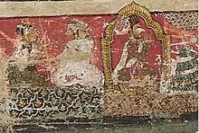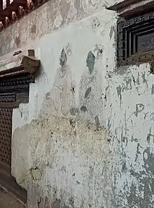 ![]() Detail of a fresco at sadāśiva chuk courtyard in the royal palace. This fresco along with all the other in the courtyard has been heavily vandalized.[1] It depicts Bhupatindra Malla between 1700-22. | |||||