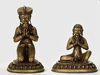 Bhupatindra Malla was raised by his mother Lālamati who played a very important role to shape the psychology of the young prince.[12] Lālamati was a powerful figure herself and is known to have helped her husband, Jitamitra Malla, in his construction works.[12] Lālamati was a connoisseur of arts and to her are attributed at least four pairs of gold-plated bronze sculptures of herself and her husband, most of them consecrated after her husband's death.[12][18]