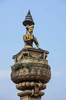 Bhupatindra Malla (Nepal Bhasa: 𑐨𑐹𑐥𑐟𑐷𑐣𑑂𑐡𑑂𑐬 𑐩𑐮𑑂𑐮; 3 November 1674 – 19 May 1722) was a Malla Dynasty King of the Kingdom of Bhaktapur (present day Bhaktapur, Nepal) who reigned from 1696 until his death in 1722. He is the most widely known king of Bhaktapur and is among the most popular of the Malla dynasty.[5] He is popularly known in Bhaktapur as nepaḥ juju, meaning the king of the Newars.[6] His reign was characterized by the construction of numerous palaces and temples with the Nyatapola temple being his most revered contribution.[5] An integral part of the local folklore, Bhupatindra Malla is regarded as a great builder and a lover of arts whose reign is considered the cultural high point of Bhaktapur.[5][7]