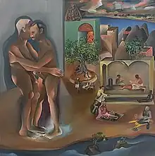 Khakhar was a self-trained artist, and started his career as a painter relatively late in his life. His works were figurative in nature, concerned with the human body and its identity. An openly gay artist,[1] the problem of gender definitions and gender identity were major themes of his work. His paintings often contained references to Indian mythology and mythological themes.