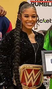 Belair made her professional wrestling debut in 2016 for WWE's developmental brand NXT, competing for the NXT Women's Championship on multiple occasions. After being drafted to SmackDown, she won the 2021 Women's Royal Rumble match, becoming the second African American after The Rock to win a Royal Rumble match. She successfully challenged for the SmackDown Women's Championship against Sasha Banks at WrestleMania 37, which marked the second time women main-evented WrestleMania, as well as the first time two African Americans main-evented WWE's flagship event.[6] In 2021, she was ranked No. 1 of the top 150 female wrestlers by Pro Wrestling Illustrated (PWI).[7] In 2023, she became the longest-reigning Raw Women's Champion with her reign of 420 days. She also has the longest reign of any WWE women's championship since 2006, with WWE promoting her as the longest-reigning women's champion of the modern era. This reign would break a couple of other records within WWE, including the longest-reigning black world champion (male or female) and the longest-reigning African American for any singles championship.
