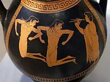 The Bibasis, a dance of men and women, was of the gymnastic kind.[3] The dance consisted in springing rapidly from the ground, and striking the feet behind; a feat of which the Spartan woman Lampito, in the Lysistrata of Aristophanes,[4] prides herself.[2] She derives her strength and her beauty essentially from this exercise.[5]