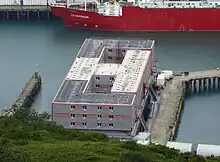 The plan is for the three-storey barge to stay in the port for at least 18 months, containing 506 asylum applicants waiting for the outcome of Home Office decisions on their cases.[19][20] The barge also contains healthcare provision, catering facilities, a multi-faith prayer room, a gym and 24-hour security.[21][22][23] The plans met with widespread opposition from various humanitarian organisations,[24] the local South Dorset MP Richard Drax[25] and local authorities. Dorset Council explored legal action to prevent the barge from arriving.[26] Nevertheless, the barge left dry dock in Falmouth on the morning of 17 July 2023 after several weeks' delay,[27] and arrived at Portland Port the following morning.[28]