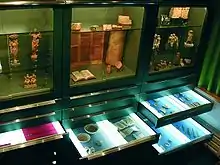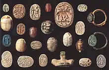 Among them are Early Paleolithic fist wedges from Syria; Near Eastern, particularly Akkadian, Old-Babylonian, Old Syrian, Mitanni and New Assyrian cylinder seals; Near Eastern, prehistoric and Iron Age stamp seals; Near Eastern terra cotta, idols, amulets, etc.; Cuneiform script boards, from Old Akkadian to Persian, partly with cylinder seal impressions; Palestinian vessels, partly from the excavations on the Tel Kinneret (Israel);[2] scarabs and similar Egyptian and Egypt-like seal amulets (worldwide the third largest collection of its kind); blank scarabs and scarab amulets; Egyptian amulets and bronzes; Egyptian amulet forms; Ancient Egyptian steles, bronzes and reliefs; clay tablets; tools; weapons; ceramics; manuscripts of biblical texts; Torah and Esther roles; a Samaritan Pentateuch; editions of the Koran; coins; lamps; Palestinian ethnologica.