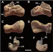 The holotype, MPCA 865, consists of the back of a skull and attached to it the back of the lower jaws.[1] The paratype, MPCA 866, is a collection of loose bones from at least four individuals, including parts of the postcrania. It includes: fragments of two premaxillae with three pairs of teeth; a piece of upper right jawbone with a tooth; pieces of seventeen vertebrae; fourteen sacral vertebrae; twenty caudal vertebrae; pieces of two shoulder blades; an upper back corner of a right raven's jawbone; the tops of three ulna; the end of a spoke bone; eight hand claws; pieces of a left femur; five upper shafts of pubic bones; five partial femurs; the tops of two left tibia; the underside of a right tibia; a right tibia; pieces of five metatarsals; fifteen phalanges, separately eight foot claws and pieces of rib.[1]