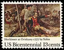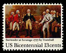 A painting-format stamp was issued January 3, 1977 for Washington's successful battle at Princeton. Similarly painting stamps were issued to commemorate the Battle of Oriskany and the Battle of Saratoga. Four stamps were issued on July 4 to honor craftsmen with the legend "Skilled Hands for Independence". Additional stamps honored the Articles of Confederation and the arrival of Lafayette. One of the Christmas stamps that year, though not formally part of the series, showed Washington kneeling at Valley Forge.