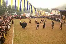 Every year since 1996 a large LARP has been organized at the venue. The Great Battle of Bicolline brings together thousands of LARPers and medieval reenactors over seven days, and culminates in a huge battle.[4] The battle is prepared for throughout the year with skirmishes and diplomacy between the various groups that attend. Everyone in attendance must dress up medieval at all times, and all modern items, such as cellphones are put away and unused. All participants submerge themselves into the world of Bicolline, getting into their roles and characters and the real world is left behind. Every detail, all the way down to the utensils used must be decorum in order to create the medieval atmosphere. The large grounds are filled with many houses as well as medieval tents.[5] There are also some designated areas where those with regular camping tents may be placed in order to minimize the viewing of modern items. Throughout the week there are several events and activities; each night there is a musical spectacle as well as a show, there are competitions and small battles which lead up to the Great Battle, as well as activities and small battles for the children.[6] The Great Battle takes place on the last day of the week (Saturday) and normally endures between 3 and 4 hours long. Each year there is a new scenario based on the events and occurrences throughout the year in the "virtual world." There are specific rules in place in order to assure safety. The age limit in order to participate in the Battle is sixteen. Upon entry into the ground, each person is given a colored bracelet according to age. Those who are under sixteen upon registration must wear a child bracelet. Those who are sixteen and older wear a different colored bracelet, ensuring that those who aren't of age are mistaken to be over sixteen. Weapons are also checked by the workers of Bicolline and are marked in order to ensure the safety of players and ensure that no unsafe weapon is used during the battle. Weapons such as swords and daggers are normally made out of foam and arrows are tipped with large amounts of foam and tape in order to avoid serious injury. There are even vendors that make and sell weapons that have already been checked and approved by Bicolline. Most participants also wear armors in leather or metal which allow for protection throughout the battle. With armor worn, a point system applies and it then takes a certain number of "touches" by a weapon in order to be considered injured or dead, depending on placement of armor and where the weapon has touched the body.