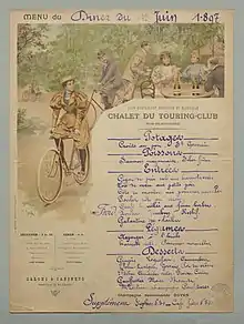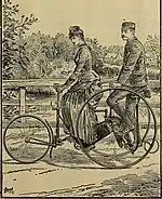 ![]() "Bicycling", a ca. 1887 color print showing one of the few ways in which it was socially acceptable for women to ride cycles, in the years before the invention of "safety bicycles" and the woman's "bicycle suit". |