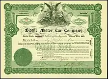 Share of the Biddle Motor Car Company, issued 1 April 1919