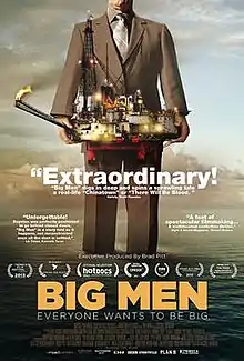 Big Men is a 2014 documentary film produced and directed by Rachel Boynton. It examines the oil industry, the development of a new oil field in West Africa, the accusations of corruption that follow, and the resource curse. The film follows Texas-based Kosmos Energy as it attempts to start oil production in the new Jubilee Field off the coast of Ghana. With huge amounts of money at stake, Kosmos juggles its partners in Ghana, financial backers in New York, and the Great Recession that dramatically reduces oil prices. The film also visits Nigeria's oil-rich Niger Delta, where decades of corruption and lack of development fuel militants, who attempt to gain a share of the oil pie. The film was released on March 14, 2014, to critical acclaim.