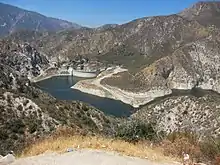In 1976, the dam was recognized as in danger of failure from earthquakes (the San Andreas Fault runs nearby) and the reservoir's level was temporarily restricted to about 25% of capacity.[8] In 2008 the Los Angeles County Flood Control District began a project to rehabilitate the aging structure.[9] Approximately 75,000 cu yd (57,000 m3) of concrete was added to the dam, transforming it from a thin-arch to a thick-arch design. A new spillway was built and the original one was expanded, increasing the floodwater capacity from 23,000 cu ft/s (650 m3/s) to more than 90,000 cu ft/s (2,500 m3/s).[7] In addition, a 24-inch (610 mm) valve was installed at the dam base to pass low flows for habitat conservation.[4] The seismic retrofit project was completed in July 2011 at a cost of $100 million.[10]