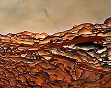 When lava next flowed over it, the heat and pressure transformed the muddy mixture. As water escaped it in the form of superheated steam, pressure variations resulted in flexing and many short fluctuating changes, reflected in the jasper's many thin, parallel bands.[1](p 58) The hydrothermal reaction progressed as a shock wave through the mud, removing iron from it and depositing the iron as intertwining bands of limonite. The altered rock remained plastic, and subject to local movement as a result of pressure changes. These caused the great variety of marbled, rosette-like and picture designs found in Biggs jasper.[1](p 59)