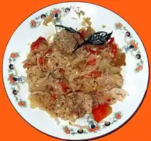 Bigos (Polish pronunciation: [ˈbʲiɡɔs] ⓘ; Belarusian: бігас,[1] bihas, or бігус,[2] bihus, Lithuanian: bigusas), often translated into English as hunter's stew, is a Polish dish of chopped meat of various kinds stewed with sauerkraut, shredded fresh cabbage and spices. It is served hot and can be enriched with additional vegetables and wine.[3] Originally from Poland, the dish also became traditional in the areas of the vast Polish–Lithuanian Commonwealth.[4][5]