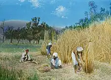 The traditional dress of Bihari people includes the dhoti-mirjai (a modified form of the flowing jama)[20] or the kurta (replacing the older chapkan which is a robe fastened on the right or on the left)[21] for men and Saree for women. In rural Bihar, men also wear a sort of plaid called Gamchha, which is often tied around the head as turban or headscarf and sometimes thrown round the body or over the shoulders.[21] In everyday life women wear saree or Salwar kameez. The saree is worn in "Seedha Aanchal" style traditionally.[22] Nevertheless, Western shirts and trousers are becoming popular among both the rural and urban male population.[22] And Salwar-Kameez for women in urban Bihar. Jewellery such as rings for men and bangles for women are popular. However, there are some traditional Bihari jewelries like "Chhara", "Hansuli", "Kamarbandh", etc.[22]
