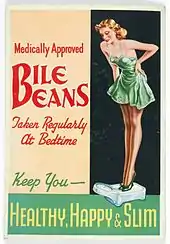 Bile Beans was a laxative and tonic first marketed in the 1890s.[1][2] The product supposedly contained substances extracted from a hitherto unknown vegetable source by a fictitious chemist known as Charles Forde.[3] In the early years Bile Beans were marketed as "Charles Forde's Bile Beans for Biliousness", and sales relied heavily on newspaper advertisements. Among other cure-all claims, Bile Beans promised to "disperse unwanted fat" and "purify and enrich the blood".[4]