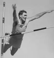 Graber won his third IC4A title in 1933 in a five-way tie for first place.[3][12] He also tied for first place at the NCAA meet, jumping 13 ft 11+116 in (4.24 m)[13] to break his own meeting record.[4] In 1934 he was national champion indoors[14] and tied for the title outdoors.[15] He almost broke his own world record in April 1935 at Santa Barbara, clearing a bar supposedly at 14 ft 5+58 in (4.41 m), but it was subsequently found that the take-off point had been two inches (5 cm) higher than the point of measurement and the record could not be ratified.[16]