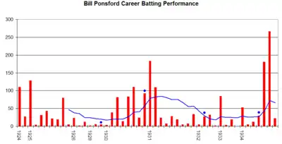An innings-by-innings breakdown of Ponsford's Test match batting career, showing runs scored (red bars) and the average of the last 10 innings (blue line). Blue markers signify an innings that ended not out.[112]