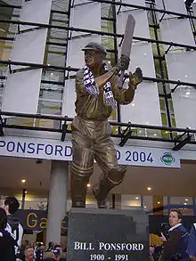 Ponsford was a shy and taciturn man. After retiring from cricket, he went to some lengths to avoid interaction with the public. He spent over three decades working for the Melbourne Cricket Club, where he had some responsibility for the operations of the Melbourne Cricket Ground (MCG), the scene of many of his great performances with the bat. In 1981 the Western Stand at the MCG was renamed the W.H. Ponsford Stand in his honour. This stand was demolished in 2003 as part of the redevelopment of the ground for the 2006 Commonwealth Games, but its replacement was also named the W.H. Ponsford Stand.[4] At the completion of the stadium redevelopment in 2005, a statue of Ponsford was installed outside the pavilion gates. In recognition of his contributions as a player, Ponsford was one of the ten initial inductees into the Australian Cricket Hall of Fame.