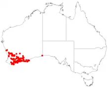 This billardiera grows in dry woodland between Manmanning, Cunderdin, Peak Charles and Mount Arid in the Avon Wheatbelt, Coolgardie, Esperance Plains, Geraldton Sandplains, Jarrah Forest, Mallee and Warren of south-western Western Australia.Avon Wheatbelt, Coolgardie, Esperance Plains, Geraldton Sandplains, Jarrah Forest, Mallee, Warren.[2][3]