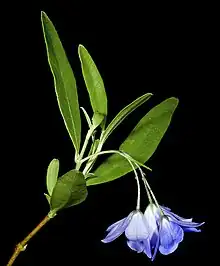 Billardiera fusiformis, commonly known as Australian bluebell,[2] is a species of flowering plant in the family Pittosporaceae and is endemic to the south-west of Western Australia. It is a sturdy, shrubby climber that has linear to narrowly elliptic leaves and blue, white or pink, nodding flowers arranged singly or in groups of up to four.