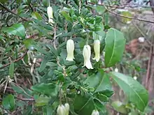 Billardiera scandens, commonly known as apple berry or apple dumpling,[2] is a small shrub or twining plant of the Pittosporaceae family which occurs in forests in the coastal and tableland areas of all states and territories in Australia, apart from the Northern Territory and Western Australia.[3] It has a silky touch and appearance that becomes more brittle as the dense growth matures. The inflorescence consists of single or paired yellow flowers, pink-tinged yellow sepals and bright yellow petals and is attached to a hairy drooping peduncle. The summer flush produces fruit of oblong berries up to 30 mm long, initially green in colour and covered in fine hair - somewhat akin to a tiny kiwifruit in appearance.[4][5][6]