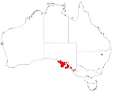 This species is endemic to the Eyre and Yorke Peninsulas in south-eastern South Australia where it grows in mallee scrub on coastal limestone and in the wheat belt.[2][3]