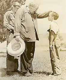 When Charles Laughton personally cast Billy Chapin for the role of young John Harper in his 1955 film classic The Night of the Hunter, the boy was already considered an "acting technician" among the child performers of his time. After a private meeting with Billy in his Hollywood home, Laughton told Davis Grubb, the author of the original story: "What I want is a flexible child, and the boy is exactly that."[6] Later, Laughton publicly offered praise especially for "...the strength of [Chapin's] innate ability to understand the construction of a scene, its impact and its importance."[4][6] Vintage sources claimed that Laughton might find it difficult to direct Chapin, as well as Sally Jane Bruce, who played his younger sister (Pearl Harper), but contemporary sources and rediscovered archival material from the production of The Night of the Hunter prove that, aside from a few intergenerational tiffs, the old man and the boy got along wonderfully, even if, according to these sources, Robert Mitchum, who played the bogus preacher Harry Powell, in fact took over some directing tasks.[6]