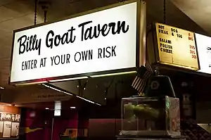 The Billy Goat Tavern is a chain of taverns located in Chicago, Illinois. Its restaurants are based on the original Billy Goat Tavern founded in 1934[1] by Billy Sianis, a Greek immigrant. It achieved fame primarily through newspaper columns by Mike Royko, a supposed curse on the Chicago Cubs, and the Olympia Cafe sketch on Saturday Night Live.