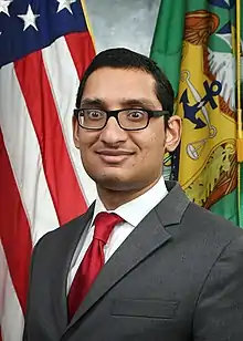 On September 13, 2018, President Donald J. Trump nominated Patel to be the Assistant Secretary of the Treasury for Financial Institutions.[9] After being confirmed by Senate voice vote with no objections, he was sworn into the position on June 20, 2019.[10][11] As Assistant Secretary for Financial Institutions, he oversaw the Office of Financial Institutions Policy, the Federal Insurance Office, the Office of Cybersecurity and Critical Infrastructure Protection, and the Office of Economic and Community Development.[12][13] During his tenure, Patel worked with the Federal Reserve on its Treasury-financed programs and forwarded the Treasury's initiatives concerning the banking system.[14][1] Upon being confirmed, Patel was the most senior Indian-American ever to serve at Treasury.[15]