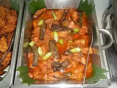 Binagoongan is a Filipino cooking process consisting of vegetables (most notably water spinach) or meat (usually pork, but can also be chicken or beef) sautéed or braised in bagoong alamang (shrimp paste), garlic, black peppercorns, and bay leaves. Some recipes also add pineapples, chilis, or coconut cream to balance the flavors. The dish is characteristically quite salty with a strong umami flavor, which is why it is always paired with white rice and never eaten on its own. It is very similar to pinatisan which is cooked with patis (fish sauce), one of the by-products of fermenting bagoong.[1][2][3][4][5][6]