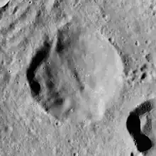 Bingham is a small lunar impact crater that is located on the far side of the Moon, relative to the Earth. It is named after the American academic, explorer and politician Hiram Bingham III.[1] It lies just to the southeast of the much larger crater Lobachevskiy, and the northwestern part of the rim of Bingham is partly overlaid by ejecta from Lobachevsky. To the northeast of Bingham is the crater Guyot, and about a crater diameter to the south-southeast is Katchalsky. This is a roughly circular crater formation with a slight outward bulge along the southeastern side.
