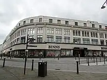 The stores were all remodelled and renamed Binns. In addition to purchasing companies, further property was purchased from W. J. Reed in Fawcett Street, Sunderland and new premises were built on Borough Road.[5][6] In 1934 the company changed its name to simply Binns Ltd., and in 1935 reported capital of over £1 million and a staff of 5,000.[1]
