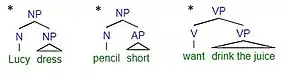 This labelling phenomenon has limitations however. Some labels can combine and others cannot. For example, two lexical structure labels cannot directly combine. The two nouns, "Lucy" and "dress" cannot directly be combined. Likewise, neither can the noun "pencil" be merged with the adjective "short", nor can the verbs, "want" and "drink" cannot be merged without anything in between. As represented by the schematic below, all of these examples are impossible lexical structures. This shows that there is a limitation where lexical categories can only be one layer deep. However, these limitations can be overcome with the insertion of an expression layer in between. For example, to combine "John" and "book", adding a determiner such as "-'s" makes this a possible combination.[39]
