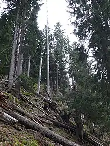Old trees absorb more CO2 than young trees, because of the larger leaf area in full grown trees.[73] However, the old forest (as a whole) will eventually stop absorbing CO2 because CO2 emissions from dead trees cancel out the remaining living trees' CO2 absorption.[lower-alpha 54] The old forest (or forest stands) are also vulnerable for natural disturbances that produces CO2. The IPCC found that "[...] landscapes with older forests have accumulated more carbon but their sink strength is diminishing, while landscapes with younger forests contain less carbon but they are removing CO2 from the atmosphere at a much higher rate [...]."[62]: 386