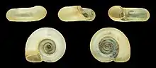 The shell of this species, like all planorbids is sinistral in coiling, but is carried upside down and thus appears to be dextral.