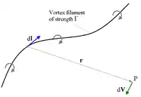 where Γ is the strength of the vortex and r is the perpendicular distance between the point and the vortex line. This is similar to the magnetic field produced on a plane by an infinitely long straight thin wire normal to the plane.